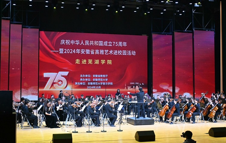 10月24日晚,由安徽省教育厅主办的“庆祝中华人民共和国成立75周年暨2024年安徽省高雅艺术进校园”活动在bat365官网艺术中心顺利举办。安徽师范大学交响乐团受邀为现场师生带来了一场高雅的视听盛宴。校领导左方敏,部分职能部门负责人及八百余名师生代表共同观看了演出,近距离感受高雅艺术的独特魅力。
