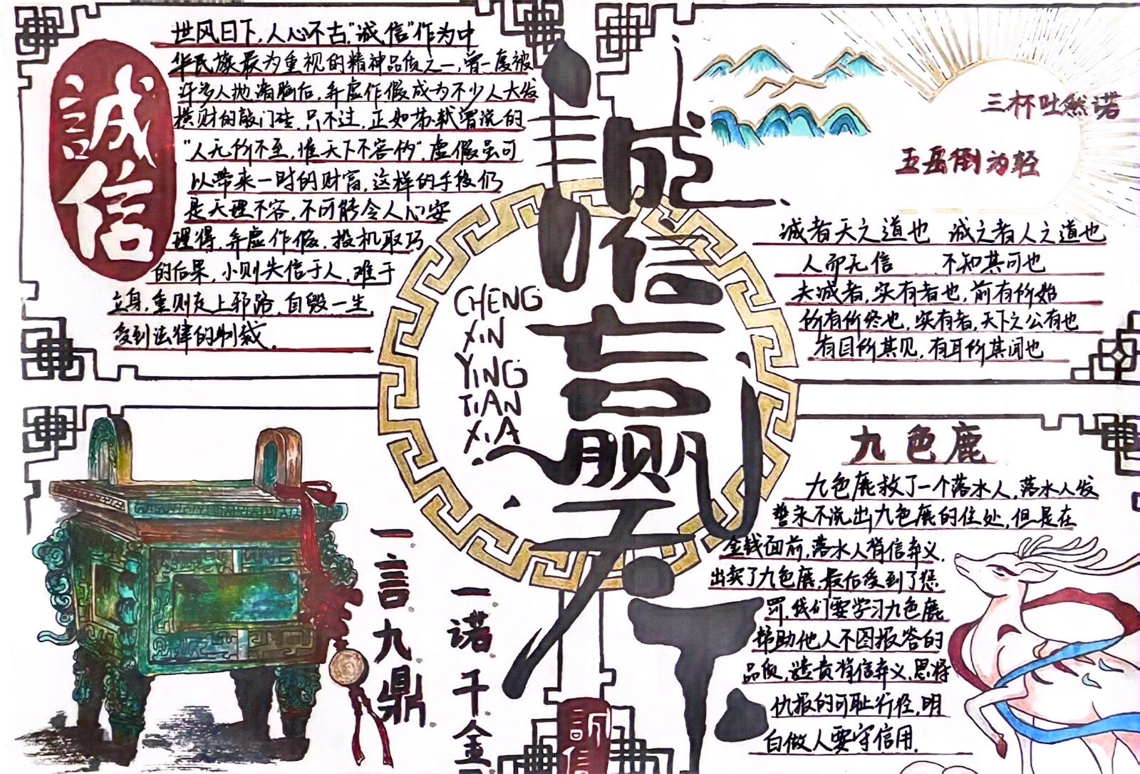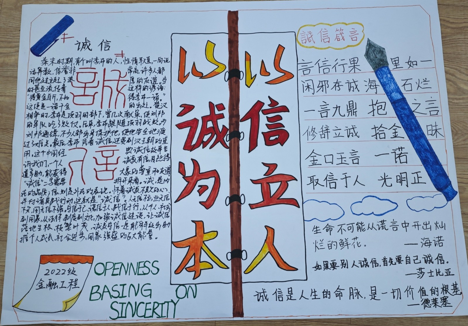 经济系积极响应学院2024年诚信教育月主题活动的号召,组织制作以“立诚于心,树信于人”为主题的资助诚信教育板报活动。此次活动旨在通过板报这一传统与创意相结合的形式,弘扬诚信精神,引导学生们树立正确的资助诚信观念,促进校园诚信文化建设。