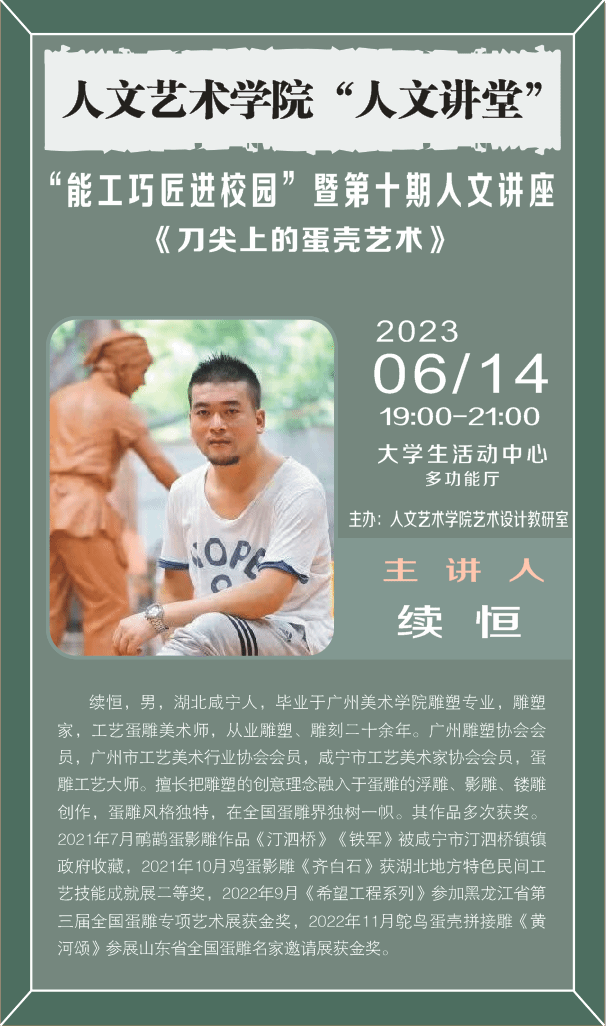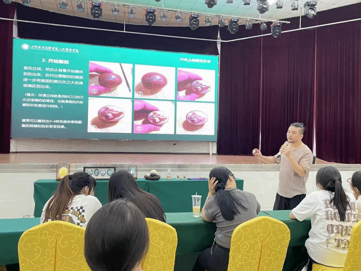 6月14日晚,kaiyun开云官方第十期人文讲堂在大学生活动中心开讲,学院特别邀请咸宁市工艺美术协会雕塑家、工艺蛋雕美术师续恒为广大学子上了一堂生动的蛋雕艺术课,带领大家走进了中国传统文化的精彩世界。艺术设计专业全体师生及2022级学前教育专业学生参加讲座。