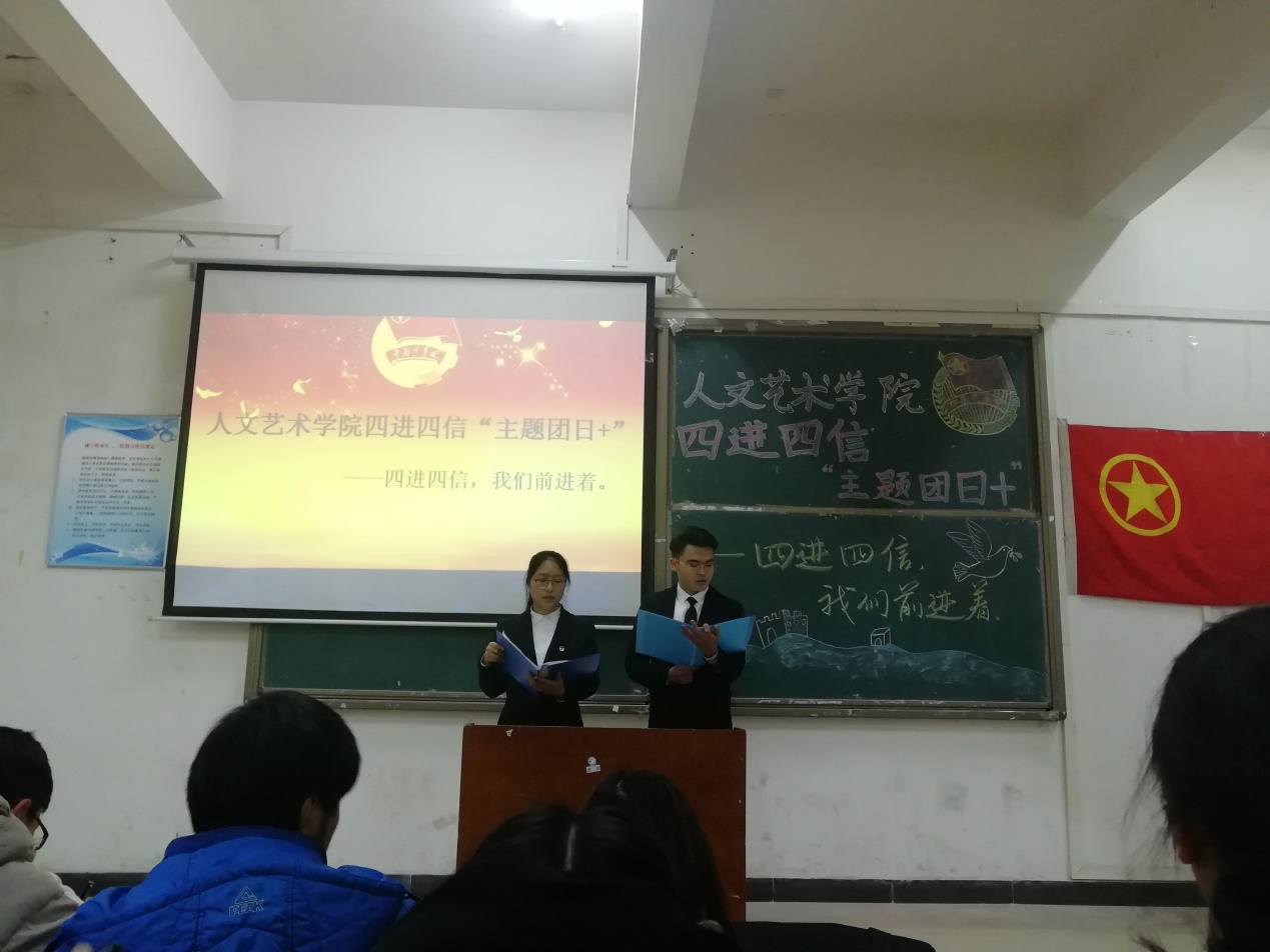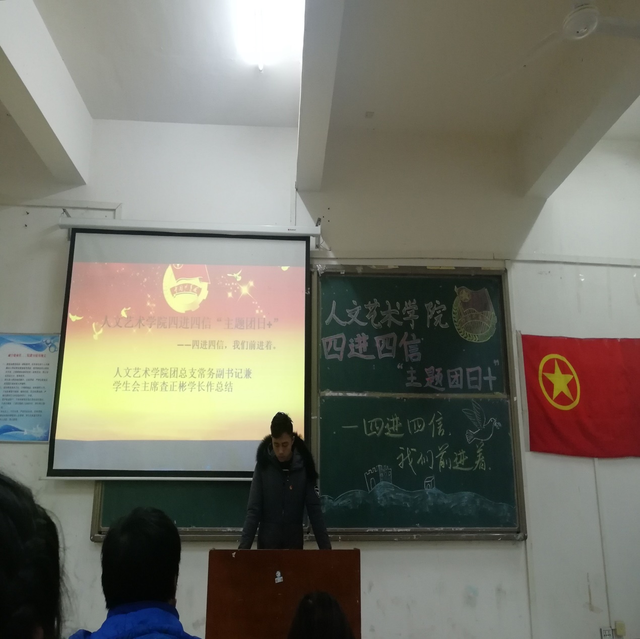 活动在充满蓬勃朝气和青春气息的《光荣啊,中国共青团》的乐声中开始。活动在充满蓬勃朝气和青春气息的《光荣啊,中国共青团》的乐声中隆重开始。团总支组织部干事梁雨同学领读团章,温故团章,增强了大家争做新时代合格共青团员的意识。18级学生代表吴宇清上台发言, 她详细阐述了“四进四信”的主要内容,“四进”即进支部、进社团、进网络、进团课,“四信”即信仰、信念、信任、信赖,并表示作为一名共青团员应当是年少有为,而非碌碌无为。团总支组织部干事聂腾宣读“主题团日+”具体内容以及相关要求,通过他们的宣讲,大家对“四进四信”有了更深刻的理解,并深刻体会到作为新时代的共青团员,要紧跟党的步伐不断前进。