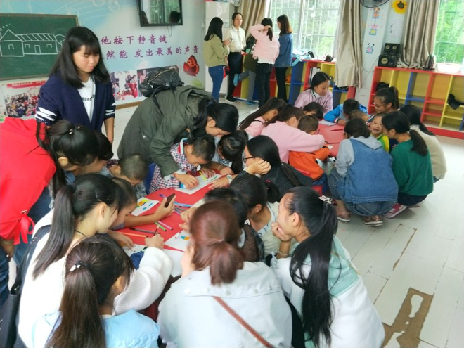 看到志愿者哥哥姐姐们到来,小朋友们都很激动,开心地跳了起来!大手握住小手,大家一起画画,一笔一画,小朋友们都很认真。没过多久白纸上就出现了房子、大树、小鸟、太阳……在他们眼里,这就是世界上最美的艺术品。小朋友们用小手轻轻环抱住志愿者的脖子,亲吻大哥哥大姐姐们的脸颊,他们用最简单的方式诉说着快乐。简单的色彩,简单的勾勒,却成就了不简单美丽。