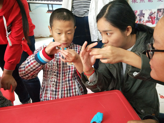 接下来志愿者们带着小朋友们玩起了太空泥,五颜六色的太空泥在大家手中像是获得了新的生命,变幻出各种各样的形状,小朋友们脸上始终挂满着甜甜的微笑。