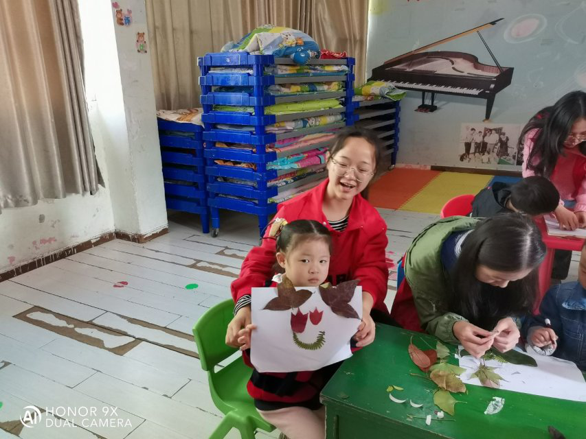 此次活动在小朋友的歌声中开始,小朋友开心地唱着交通儿歌,在轻松愉悦地氛围中进行交通安全知识地学习。在冬初这个美丽的季节,屋外的颜色总是那么迷人,志愿者和小朋友们在屋外拾起落叶进行了树叶手工画制作,并利用手工纸叠千纸鹤。在志愿者的带领下,一幅幅生动形象的树叶画、一个个漂亮的千纸鹤就诞生在小朋友的手中。在丢手绢时,志愿者和小朋友们一起唱歌和跳舞,一阵阵欢快的笑声在房间回荡。