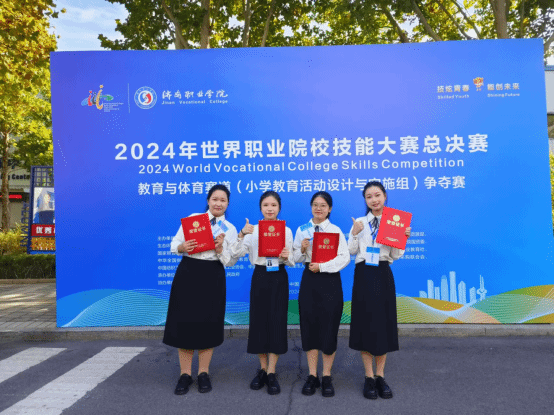 10月25日-28日,2024年世界职业院校技能大赛总决赛教育与体育赛道“小学教育活动设计与实施组"争夺赛在山东济南职业学院举行,来自全国49支参赛队参加比赛。经过激烈角逐,开云官网kaiyun开云官方小学教育专业李奕、洪宝玲、李慧玲、郭含清四位同学以小组第二名荣获团体银奖。