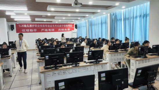 上午10时,同学们在教育实训中心601和605机房按照要求登录考试系统,开始理论考试。同学们沉着应答,考场秩序井然,考风良好。中午12点,实操考试时,每位考生都严格按步骤依次前往备物间抽题、领取试卷、准备实操物品、积极备考。过程中,同学们自信大方,技能操作严谨规范、有条不素,表述清晰准确,展现了良好的专业素养和职业能力。最终23级早期教育专业68名学生全体通过考试,考证通过率达到100%。