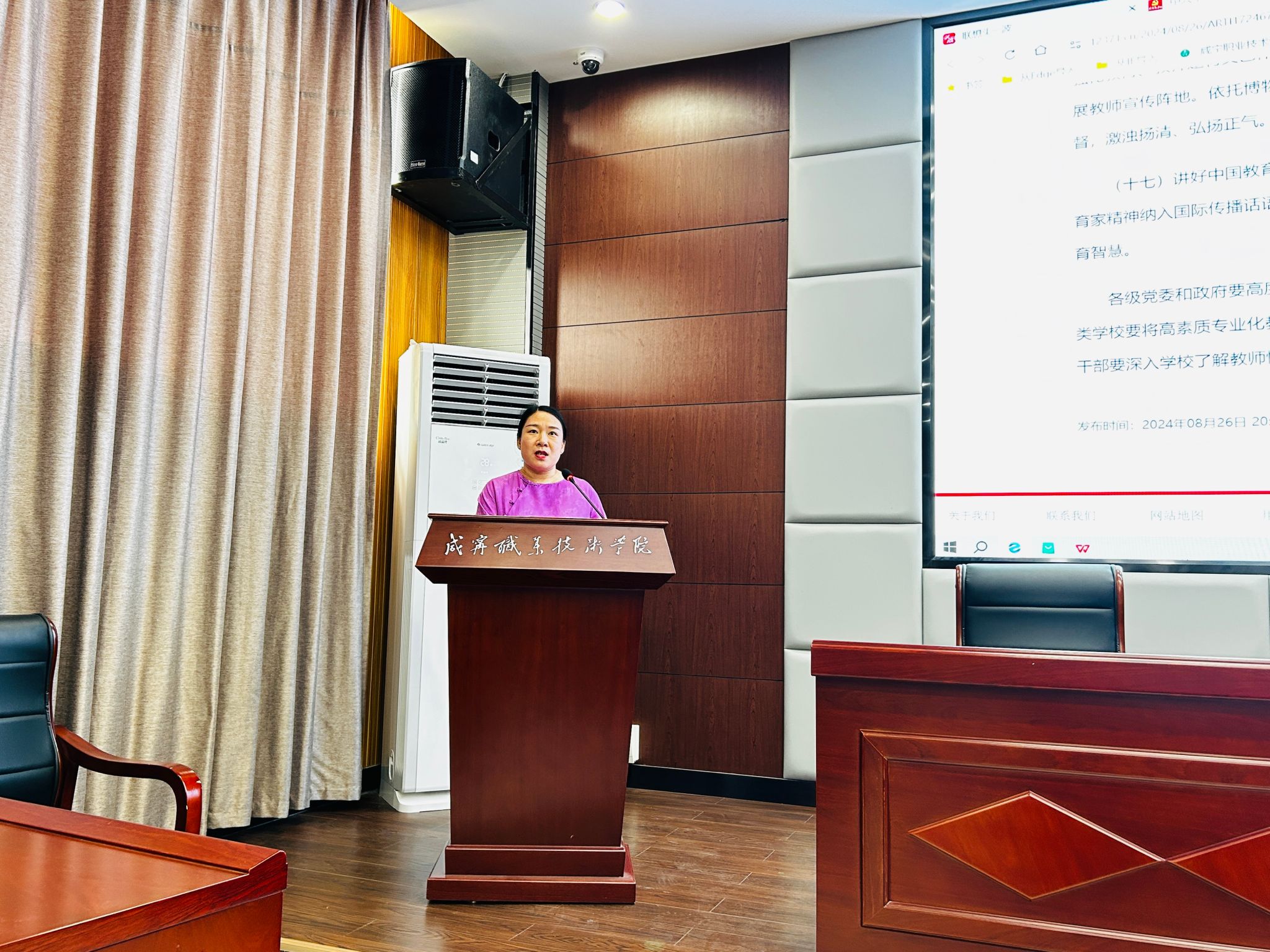 首先,袁苗苗传达学习党的二十届三中全会精神,领学《中共中央关于进一步全面深化改革、推进中国式现代化的决定》。副院长肖琼领学《中共中央 国务院关于弘扬教育家精神加强新时代高素质专业化教师队伍建设的意见》(以下简称《意见》)。随后,今年十佳师德标兵余娟和十佳辅导员代表汪淑娴分别讲述她们获奖的事迹,新进教师代表黄温馨分享学习心得。