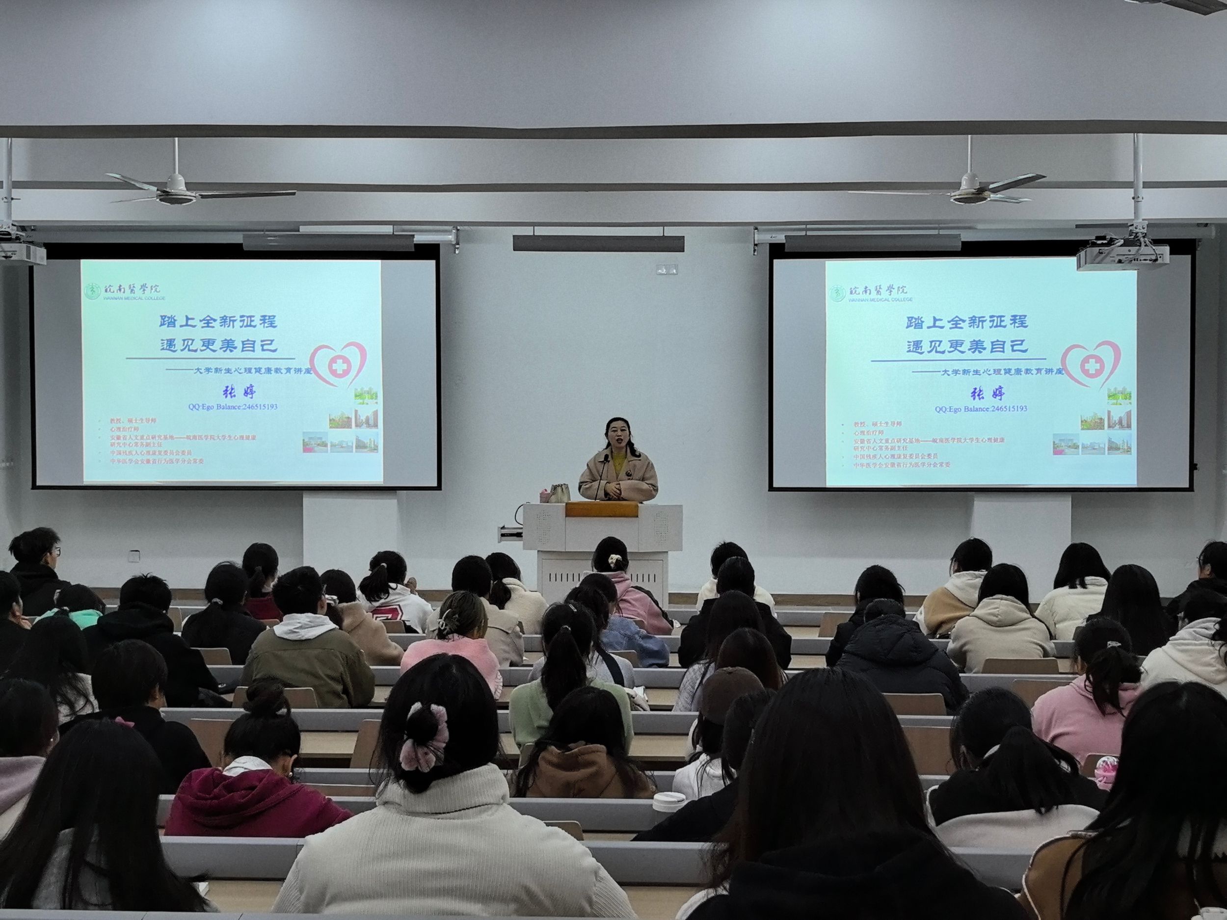 张婷教授以大一新生入校以来经历的各类活动为切入点,深入浅出地引领皖江学子认识正确开启大学学习生活的方式,启发对心理健康的重点关注,从专业视角解读“健康”与“心理健康”的概念。结合生活环境和学习环境发生的变化,引导皖江学子认识常见的心理困惑,并提出防治适应不良的有效建议,鼓励新生们要走好适应大学生活的第一步,为心理赋能,为生活添彩,为学习增效,为人生提质。