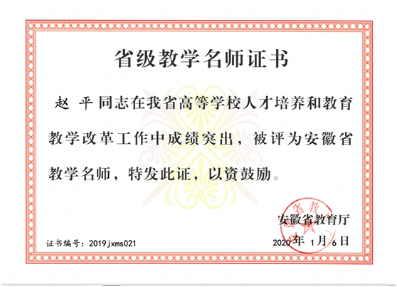 2020年1月,马克思主义学院教师赵平教授荣获“安徽省教学名师”光荣称号。