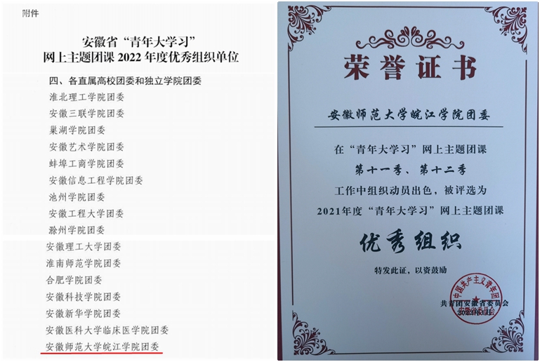 近日,安徽省“青年大学习”网上主题团课2022年度“成绩单”出炉,根据各单位参学率和参学人数,共青团安徽省委员会继2021年再次授予我院团委优秀组织单位,表彰其在该项工作中的突出表现。