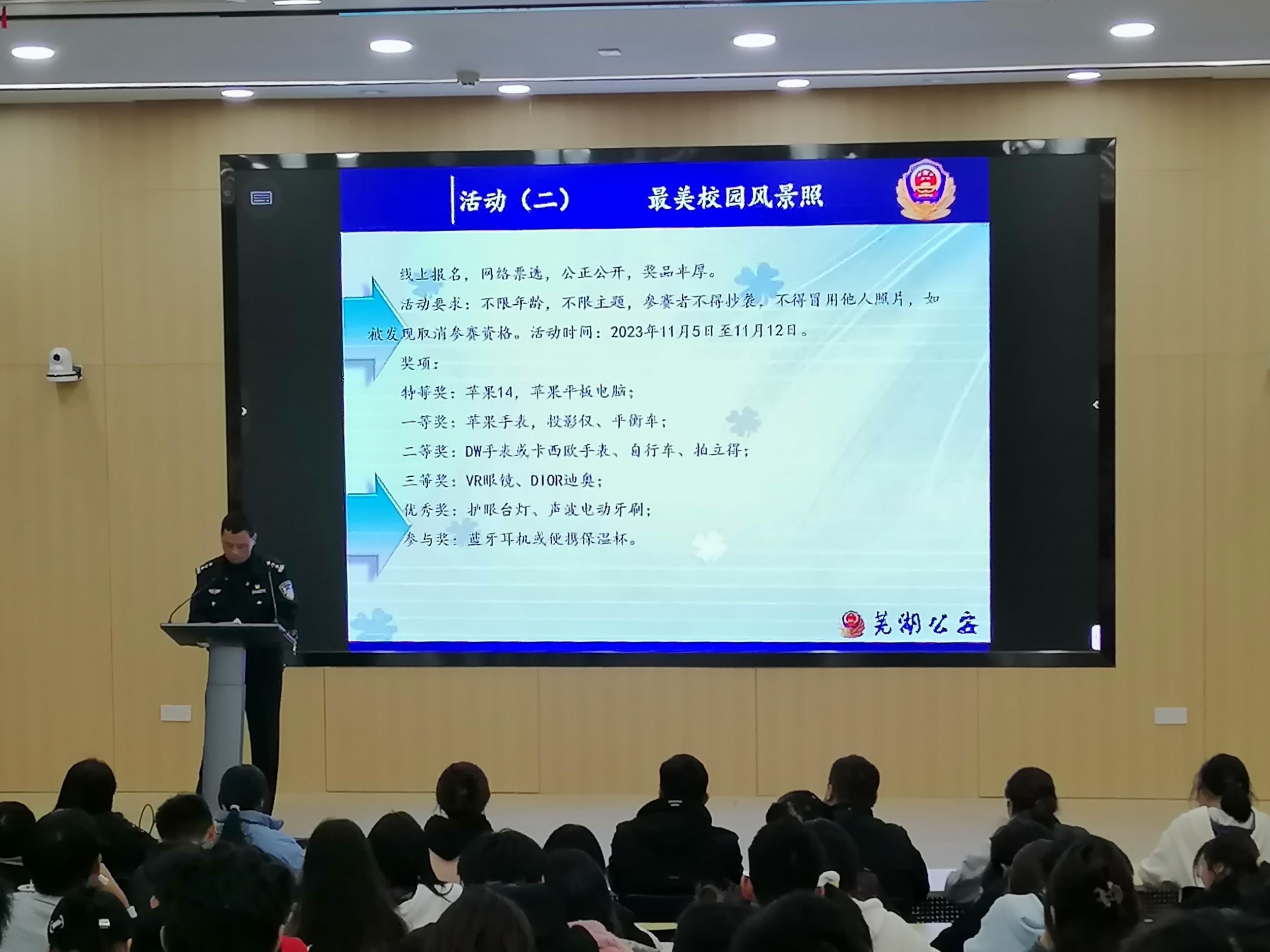 为加强我院学生安全防范意识,11月17日中午,学院后保处和团委邀请鸠江区二坝镇派出所副所长张官文在七号楼1楼报告厅开展反诈骗宣传讲座,各学生社团200余名负责人参加本次讲座,讲座由团委俞珍珍老师主持。