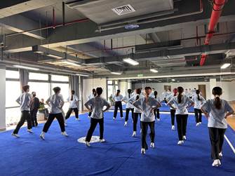 在课程的开始,王嫣祺老师带领同学们进行热身运动。通过集体跳健美操的基本步法,一组手臂控制的动作,一组手臂力量练习的俯卧撑,同学们伴随音乐的节奏跳动,渐渐投入到健美操课程中。在热身运动时,王嫣祺老师时刻关注着同学们,及时纠正一些动作错误,不规范的同学,指导做出正确的动作,避免在运动过程中受伤。具体热身活动结束后,接下来就是街舞啦啦操。王嫣祺老师播放音乐,让同学们复习舞蹈已学过的部分,集体跳,一排一排的跳,以此达到温故而知新的目的。在确认同学们能够跟上音乐,动作一致之后开始学习新的动作。王嫣祺老师开始亲自教学示范,每一个动作都对应着每个节拍,慢动作教学示范是为了让学生更加易懂易学,取得了较好的课堂氛围。