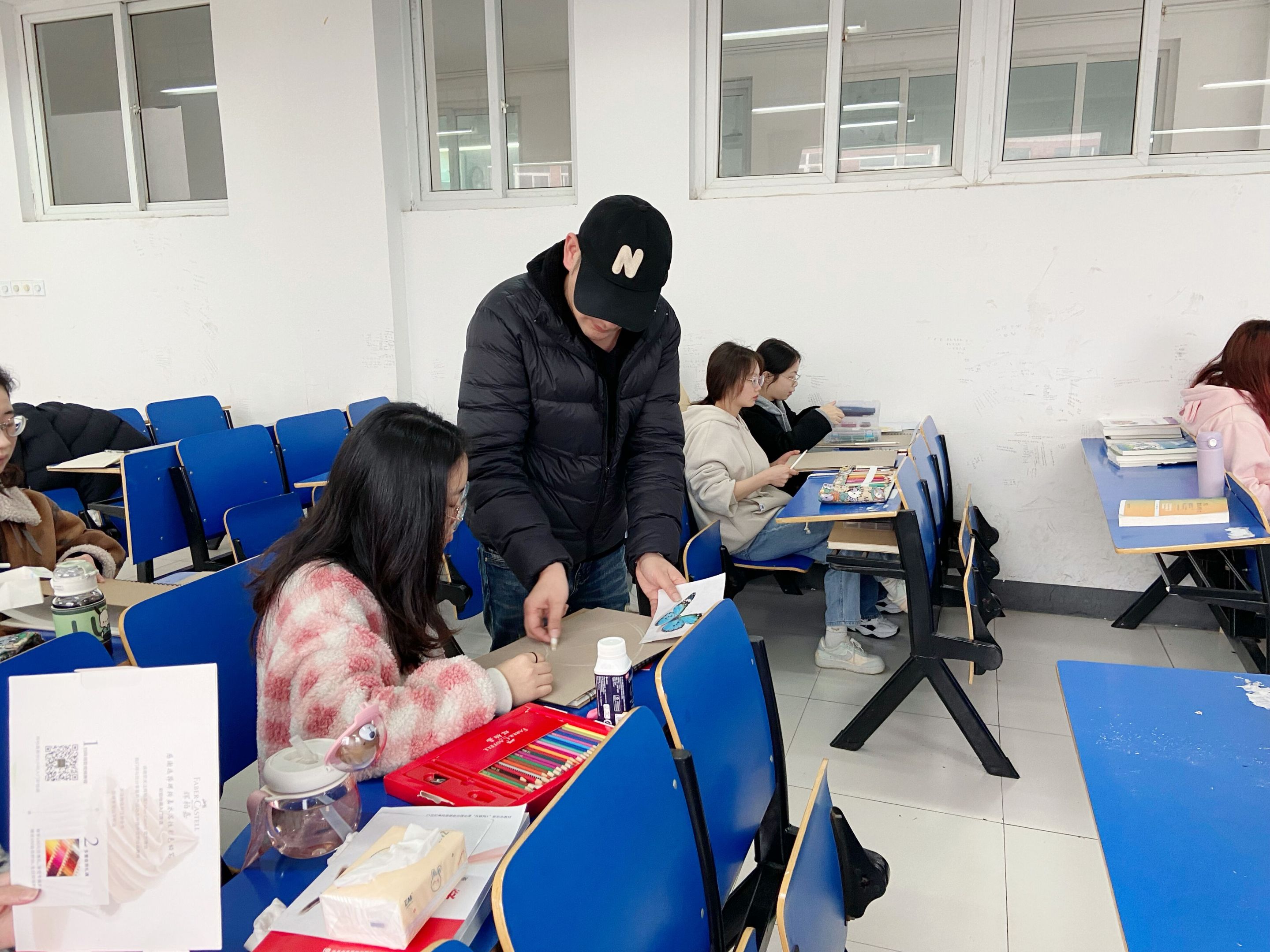 金毅以作业点评的方式导入课程,引导学生主动发现了在部分作业中出现的颜色衔接不流畅方面的问题。接着,他讲解了此类问题的常用解决方法,从线条运用、融色手法方面进行了直观示范。为了帮助学习更好地在彩铅绘画过程中运用色彩,他介绍了留白技法、单色和多色叠色技法等常用的绘画技法,并解析了互补色的运用方法。随后,他布置了课堂练习任务,并采用逐一指导的方式帮助学生练习着色。