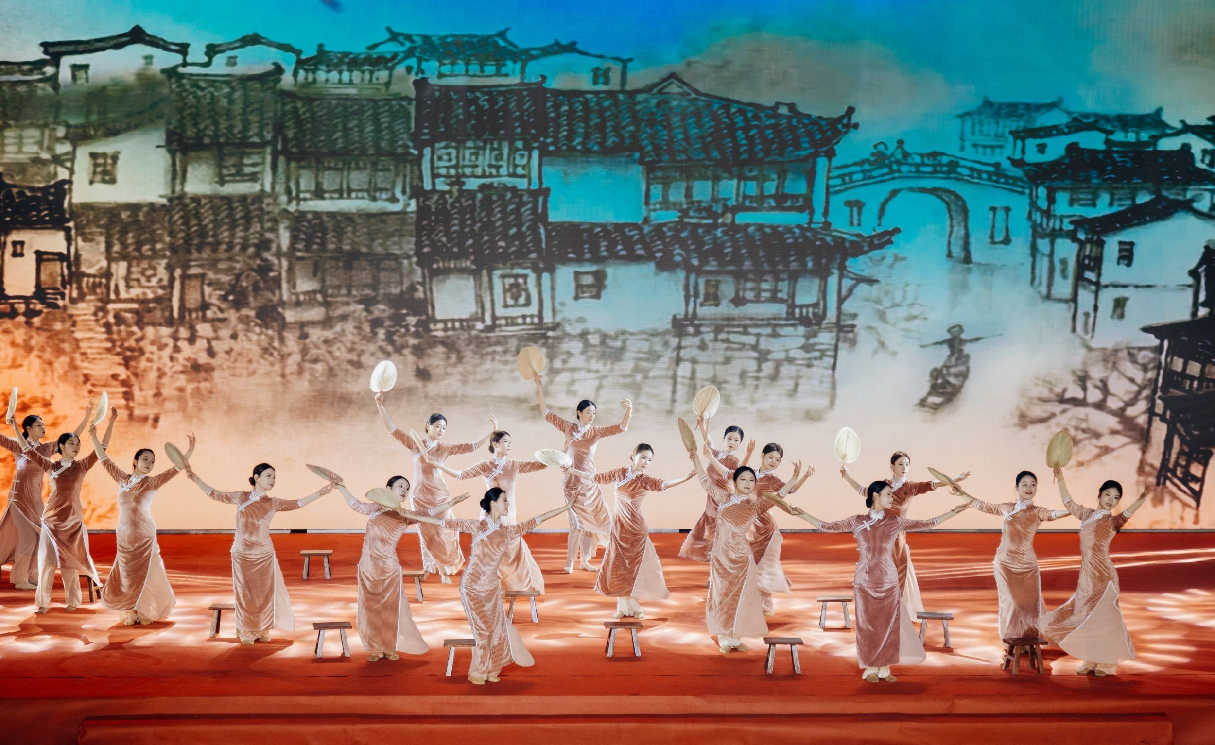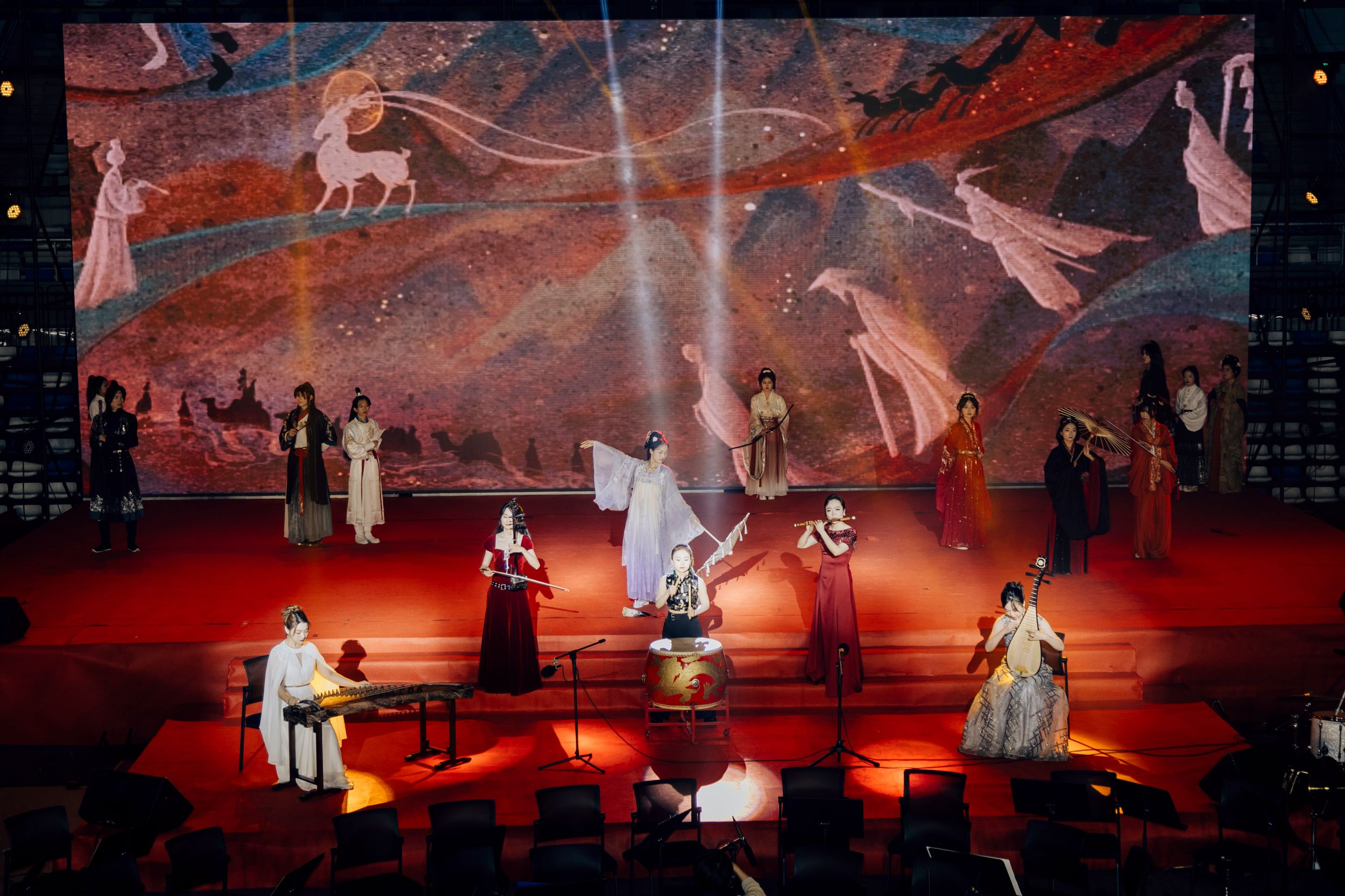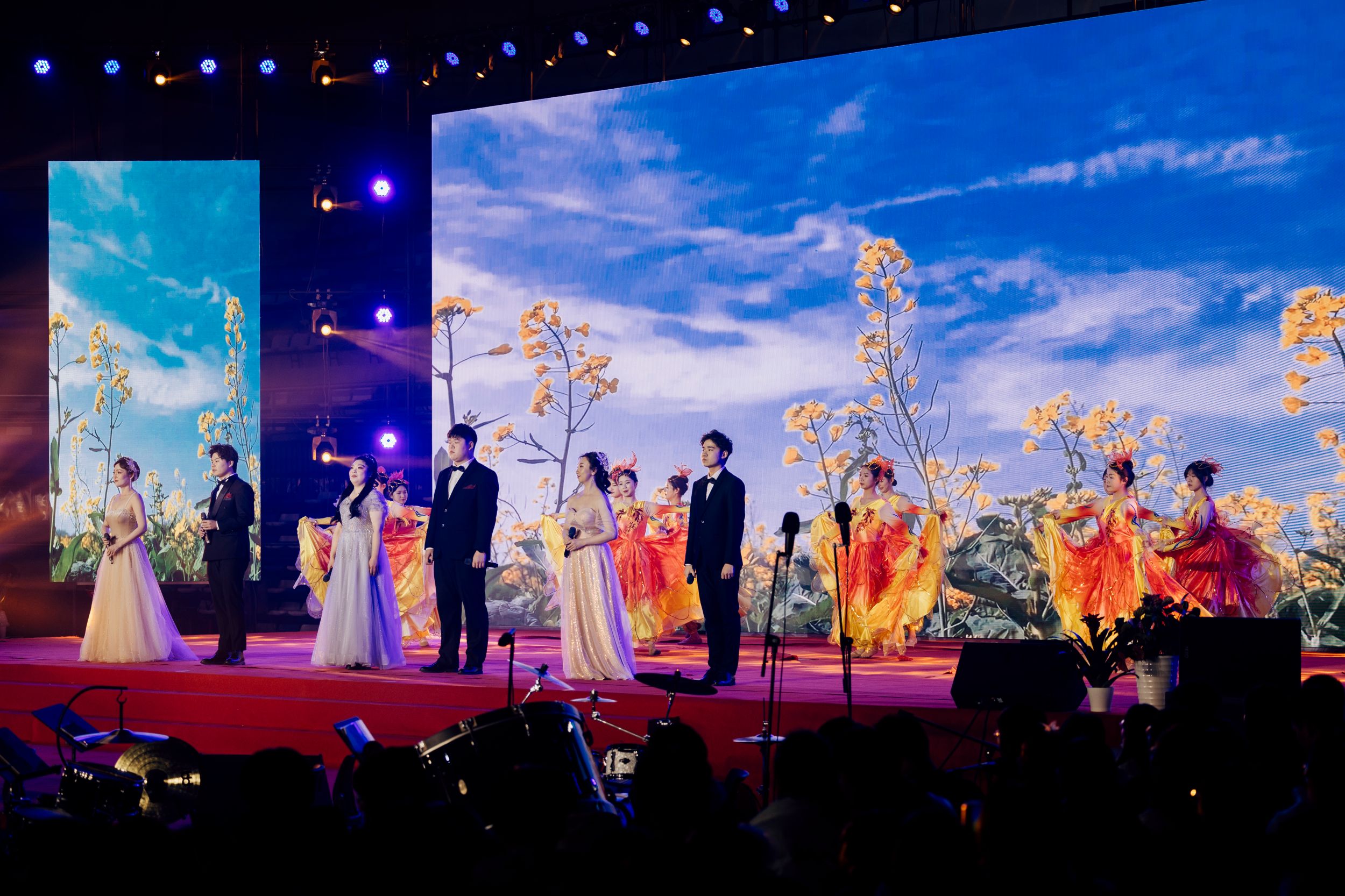 少年有意气,少年有志气。以青春为主题的第二篇章在歌曲串烧《山河图》《龙的传人》《灯火里的中国》《奢香夫人》《我的中国心》中展开。师生同台,唱出家国情怀,将全场气氛推向高潮。其中《奢香夫人》更是引发现场观众合唱。音乐系、大学生艺术团舞蹈团以及汉服社共同呈现的民乐表演《国潮音画》美轮美奂。笛音悠扬,鼓乐合鸣,或深沉雄厚,或宛转悠扬,身着汉服的学子从乐声中缓缓走来,一举一动显东方之美,传大国风貌。“枝头桃花红,陌上杨柳绿”,而由音乐系、学前教育系以及大学生艺术团舞蹈团带来的另一重唱节目《春风十万里》则是唱出了春的美妙,一元复始,万象更新。