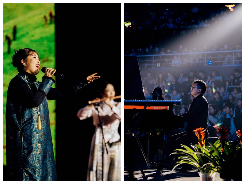 少年有意气,少年有志气。以青春为主题的第二篇章在歌曲串烧《山河图》《龙的传人》《灯火里的中国》《奢香夫人》《我的中国心》中展开。师生同台,唱出家国情怀,将全场气氛推向高潮。其中《奢香夫人》更是引发现场观众合唱。音乐系、大学生艺术团舞蹈团以及汉服社共同呈现的民乐表演《国潮音画》美轮美奂。笛音悠扬,鼓乐合鸣,或深沉雄厚,或宛转悠扬,身着汉服的学子从乐声中缓缓走来,一举一动显东方之美,传大国风貌。“枝头桃花红,陌上杨柳绿”,而由音乐系、学前教育系以及大学生艺术团舞蹈团带来的另一重唱节目《春风十万里》则是唱出了春的美妙,一元复始,万象更新。