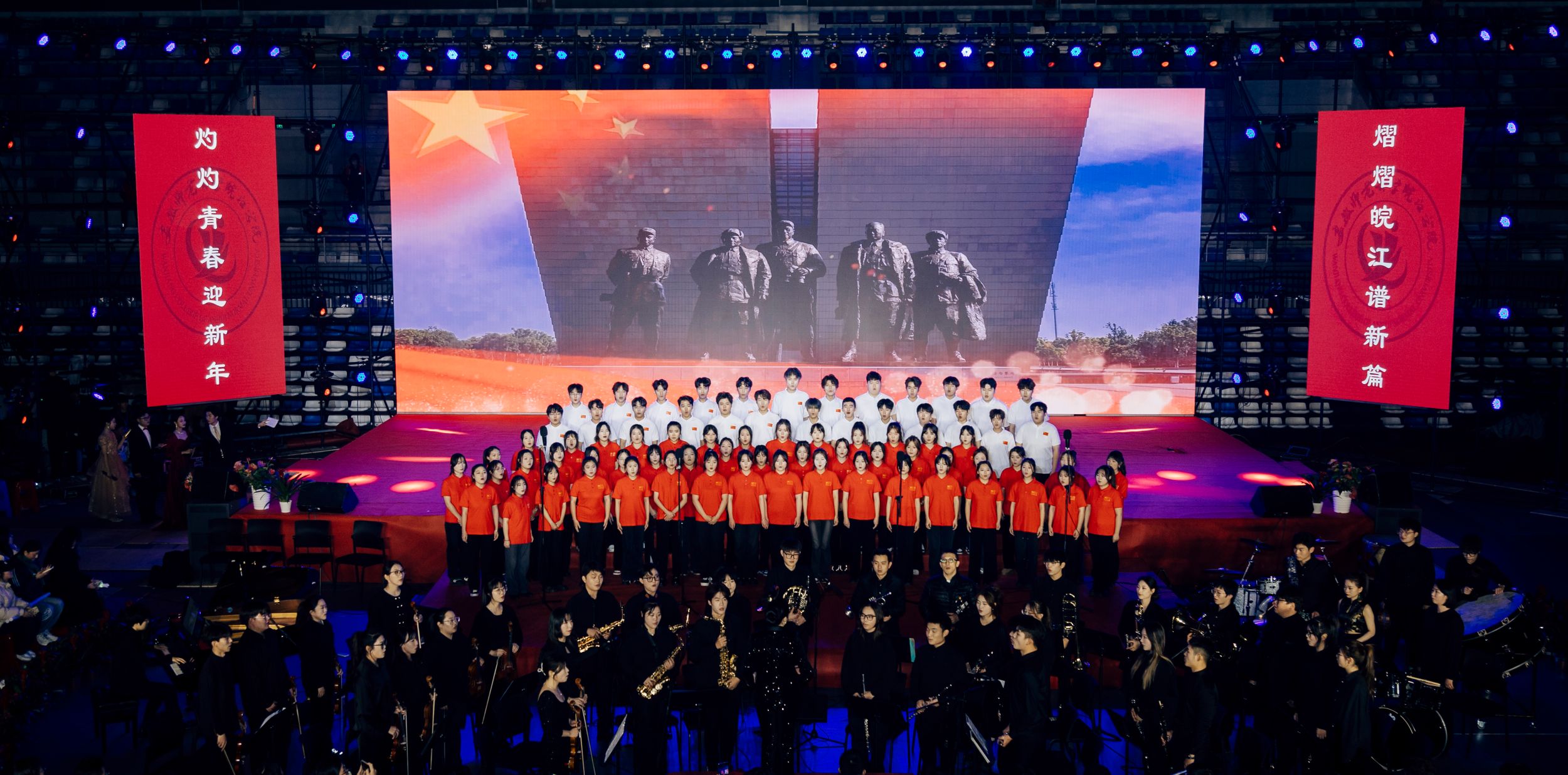 绚烂的青春在舞台绽放,自强的种子在江北播撒。第三篇章自此而始。莲灯盏盏亮起,舞者踏节而来。舞蹈《远古的呼唤》舞出丝绸之路上遥远的呐喊,在新年之时送上最美的祝福。除此之外,辅导员们与街舞社合作带来节目《一起向未来》也传递着手牵手、心连心,师生携手同行,共迎未来挑战的美好寓意。管理系、大数据与人工智能系与戏曲社携手打造的戏曲小品《福禄寿喜贺新年》掀起了晚会又一高潮,声情并茂的唱腔,幽默写实的内容引发全场欢笑,台上台下气氛融洽,反响不断。忆往昔,岁月峥嵘;看今朝,海晏河清。生在幸福时代当不忘来时之路,大学生艺术团合唱团以一首《追寻》唱出滚烫炽热的赤子之心,唱出追寻千年不变的信仰。不忘初心,牢记使命。晚会尾声在全场齐唱《歌唱祖国》中落下帷幕。歌声荡气回肠,响亮会场,激励着皖江人砥砺深耕,笃行致远,为建设美好皖江和实现中华民族伟大复兴的中国梦而奋进。