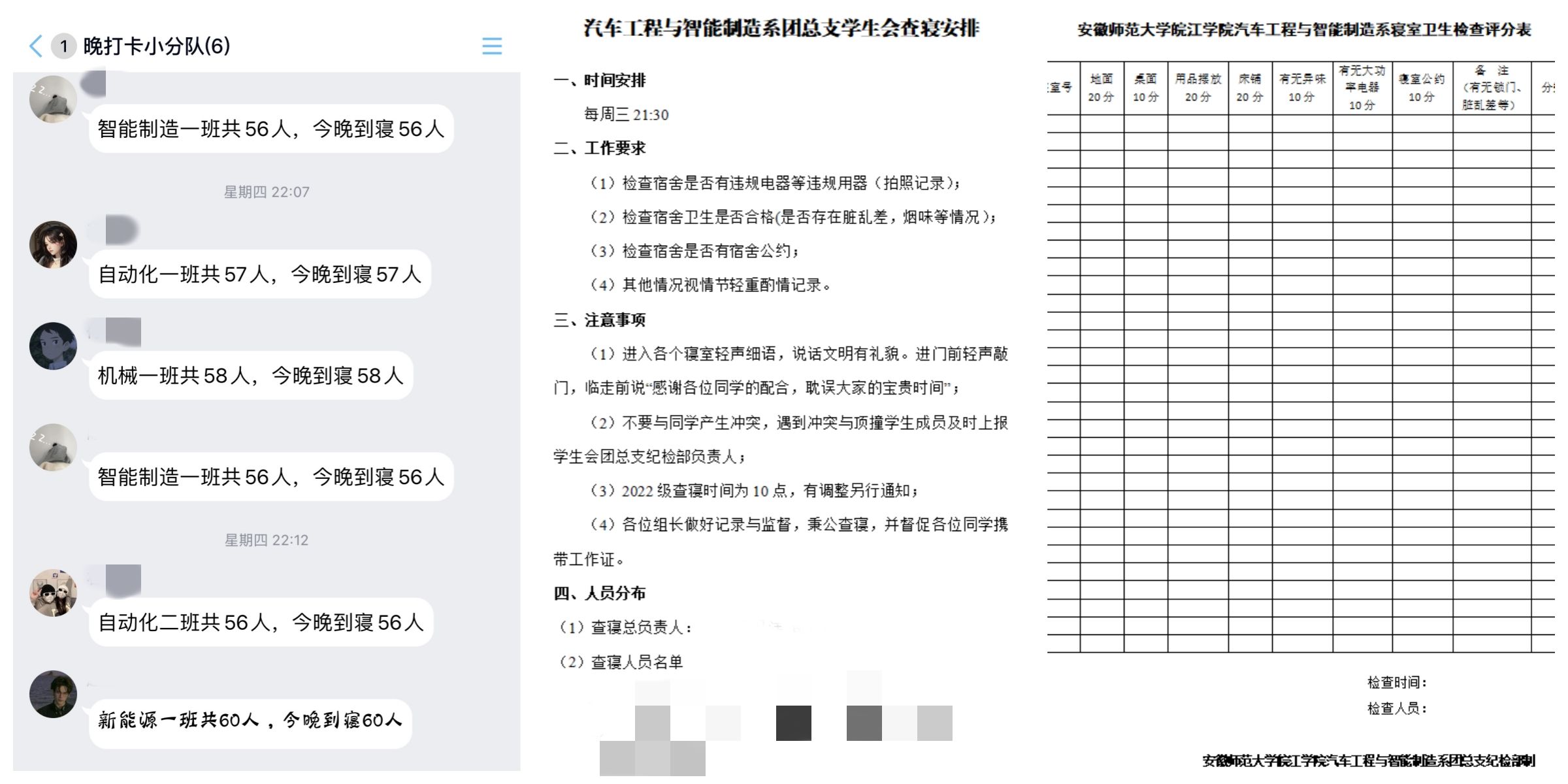 为加强学生寝室管理,各班级辅导员定期深入学生宿舍,开展春季寝室安全排查与卫生大检查工作。走访过程中,提醒同学们严禁使用违规电器,不私接、乱拉电线,避免出现安全隐患;要求寝室成员及时清理生活垃圾,营造安全卫生、文明有序的宿舍环境。此外,团总支学生会相关部门定期开展宿舍安全卫生检查,并对检查结果进行公示。各班级安全委员、寝室长严格实行每晚点名制度。寝室排查工作常态化推进,学生自我教育、自我管理、自我服务意识有所提高。
