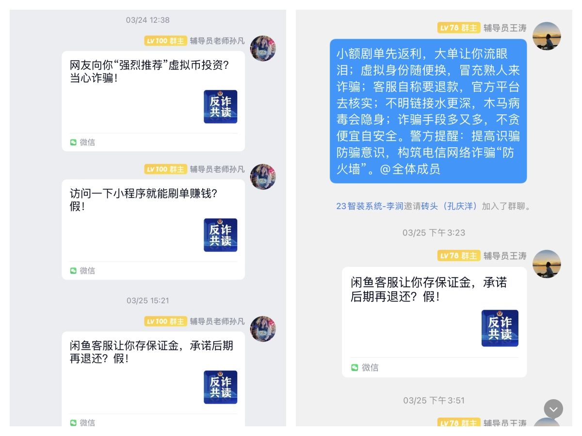 为增强学生防骗意识和防骗能力,系部结合线上线下开展防范电信网络诈骗宣传教育工作。线上班级群定期推送安全知识信息和防盗防骗提醒信息,加大宣传力度,构筑安全防线,引导全体学生将安全意识内化于心,外化于行。